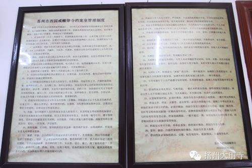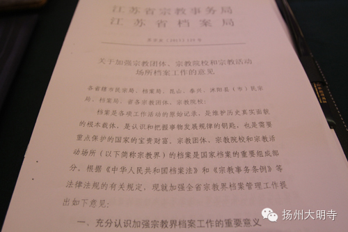 2014年8月5日~8日,扬州大明寺编者有幸应邀参加全省宗教档案工作培训;参观学习常州天宁寺、无锡祥符寺、苏州西园寺等三、四、五星际档案室,文件材料室;了解档案的原始性、珍贵性、以及在这方面的薄弱性乃至今后如何做好档案工作,未来如何处理问题有了一些大致性的方向。