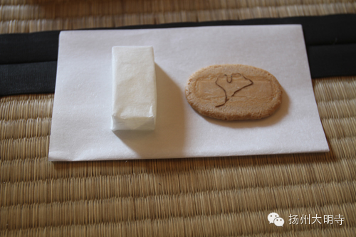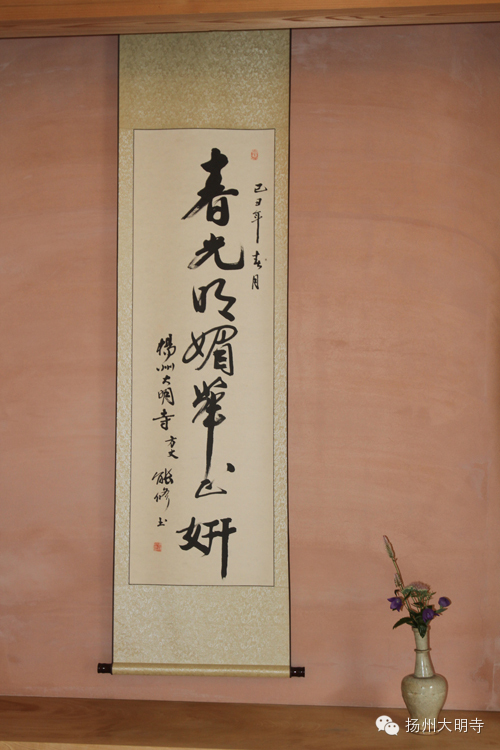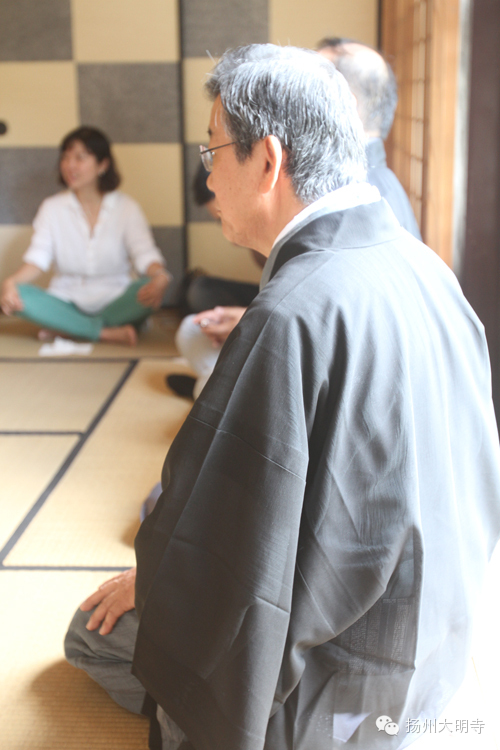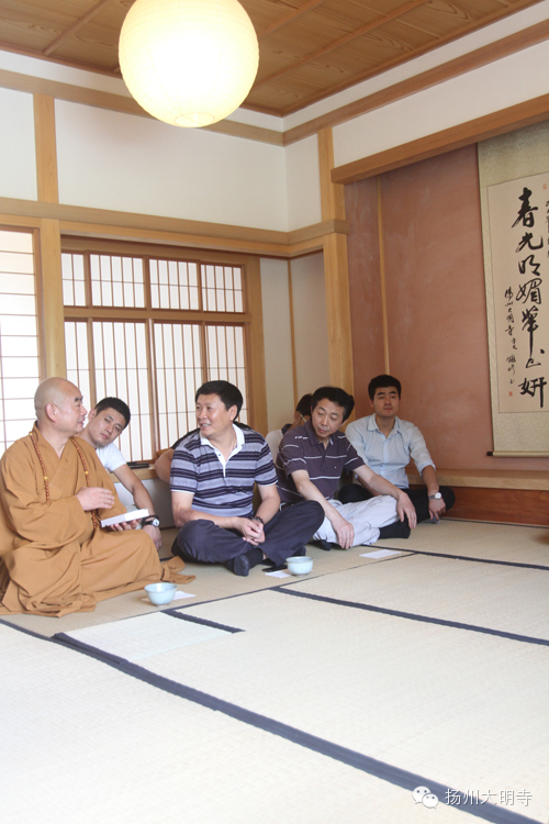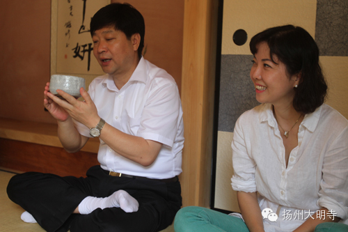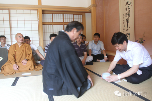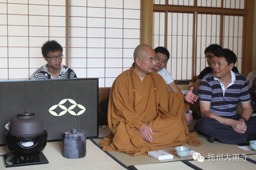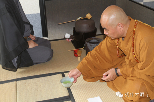 2014年9月14日,扬州大明寺能修大和尚带领善信在西花园日式茶室内,一起品尝抹茶,观赏茶道。