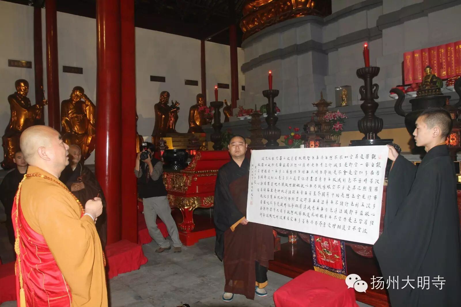 千年古刹大明寺历代高僧辈出,人文荟萃,其所在的蜀岗被誉为古城扬州的“文化高地”,现今扬州大明寺方丈能修大和尚为推动佛教的文化事业,诚邀全国百位名书法家各写《心经》一部,齐集于寺内展出,此乃佛门之殊缘,文化之盛世,并因此殊胜因缘、广结善缘、普皆回向、祈愿世界和平、众生安乐!是为之盼!