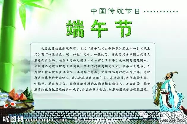 屈原,楚国大夫,爱国诗人,着有《离骚》、《天问》、《九歌》、《九章》、《招魂》等名篇。因被陷害多次免职,最后眼看国家无望,悲愤自沉汨罗江。屈原投江为五月五日,楚地原有“因想苍梧郡,兹日祀东君”的传统节日,后来就作为纪念屈原的日子,并将他视为水神,立祠祭祀。这时,开始与竞渡风俗结合,形成新的传说,大约六朝以后与端午节相连,成为全国性的纪念活动。“五月五日,竞渡,俗为屈原投汨罗日,伤其死,故并命舟楫以拯之”。